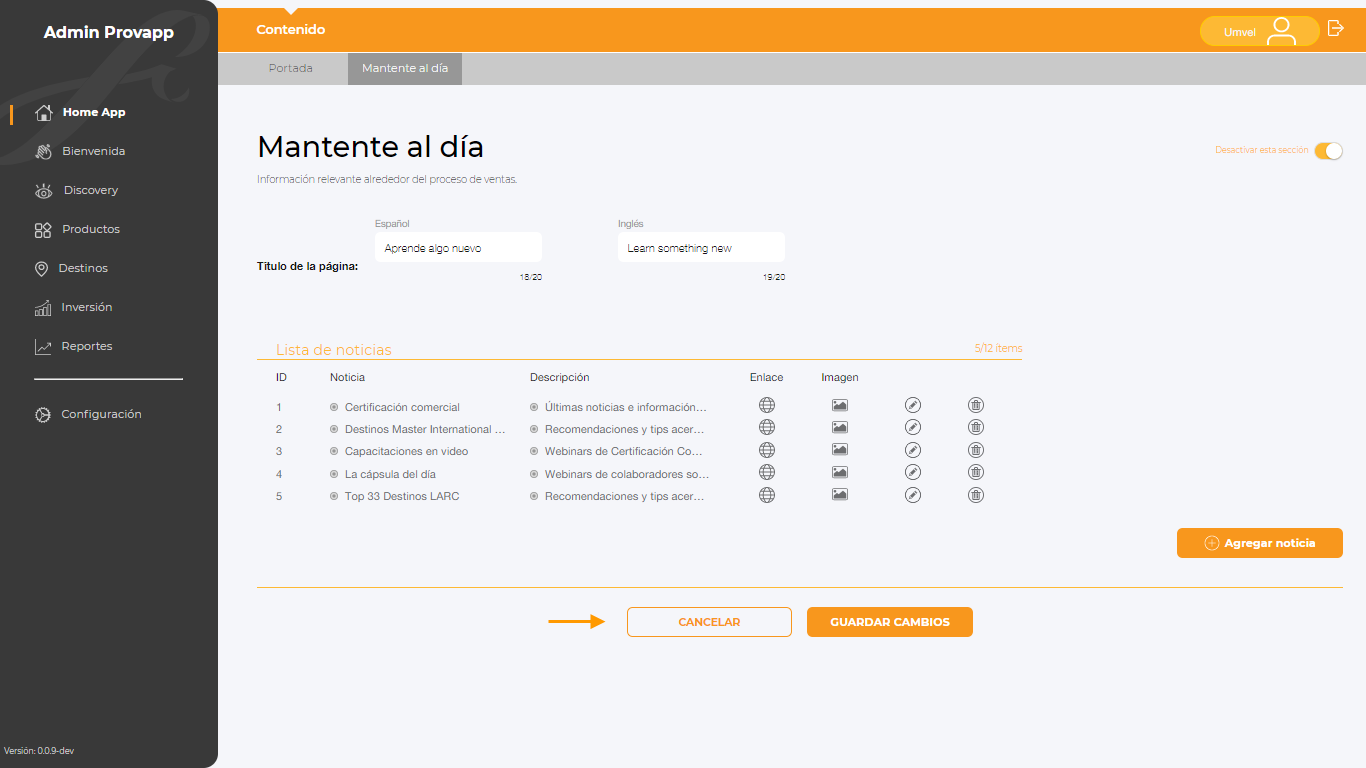 Nota: Para desactivar la sección, realizar el mismo proceso, es importante mencionar que no se mostrará en la aplicación.