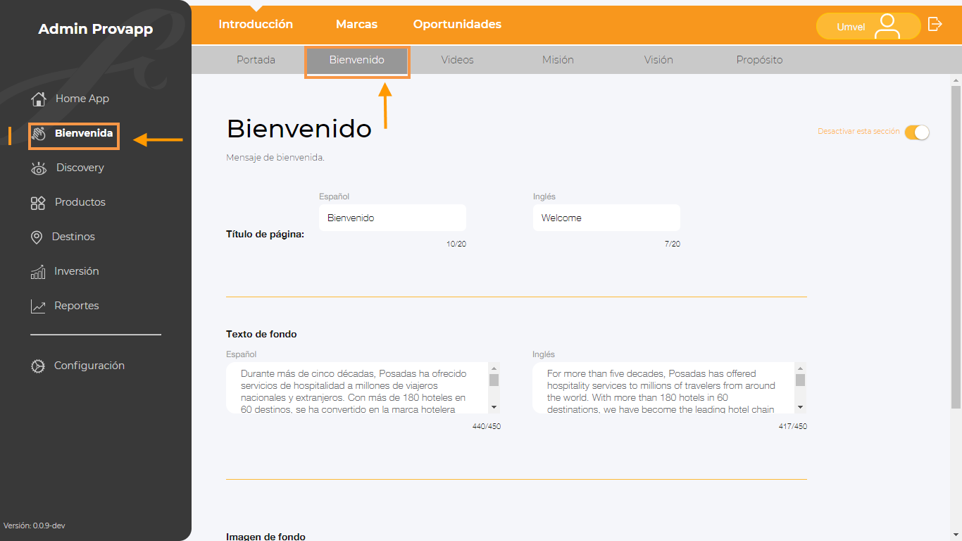 8.- Para desactivar la sección, dar clic en el switch Desactivar esta sección