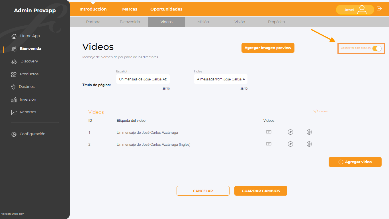 7.- Si desea desactivar la sección, dar clic en el switch Desactivar esta sección