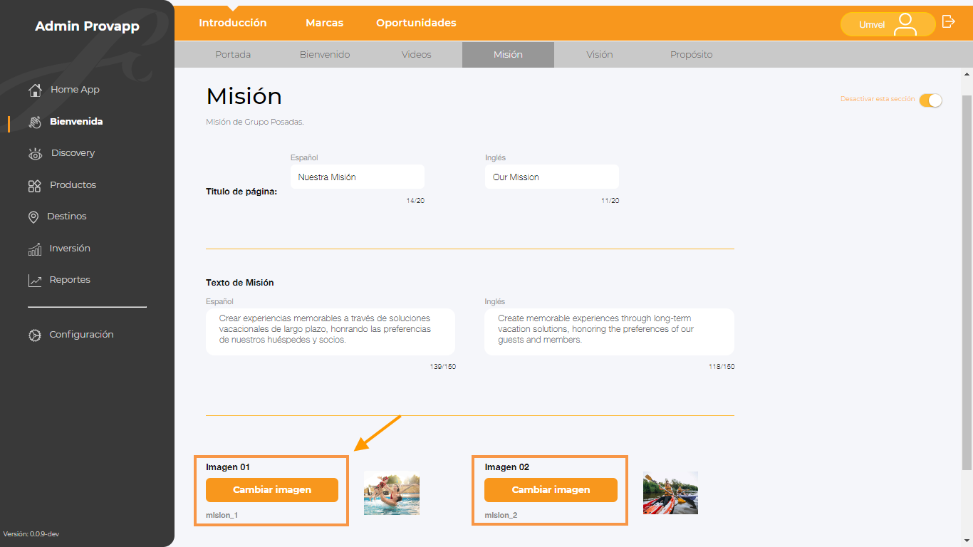 3.- Para editar el Texto de Misión, posicionarse en el recuadro del lenguaje que desea modificar o en ambos.
