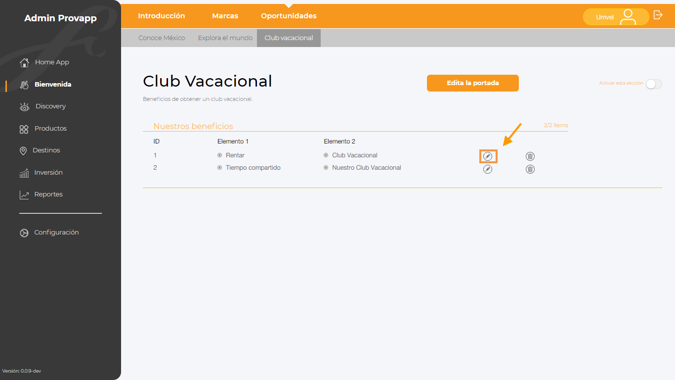 6.- Para editar el apartado Nuestros beneficios, posicionarse en el icono de lápiz y dar clic.