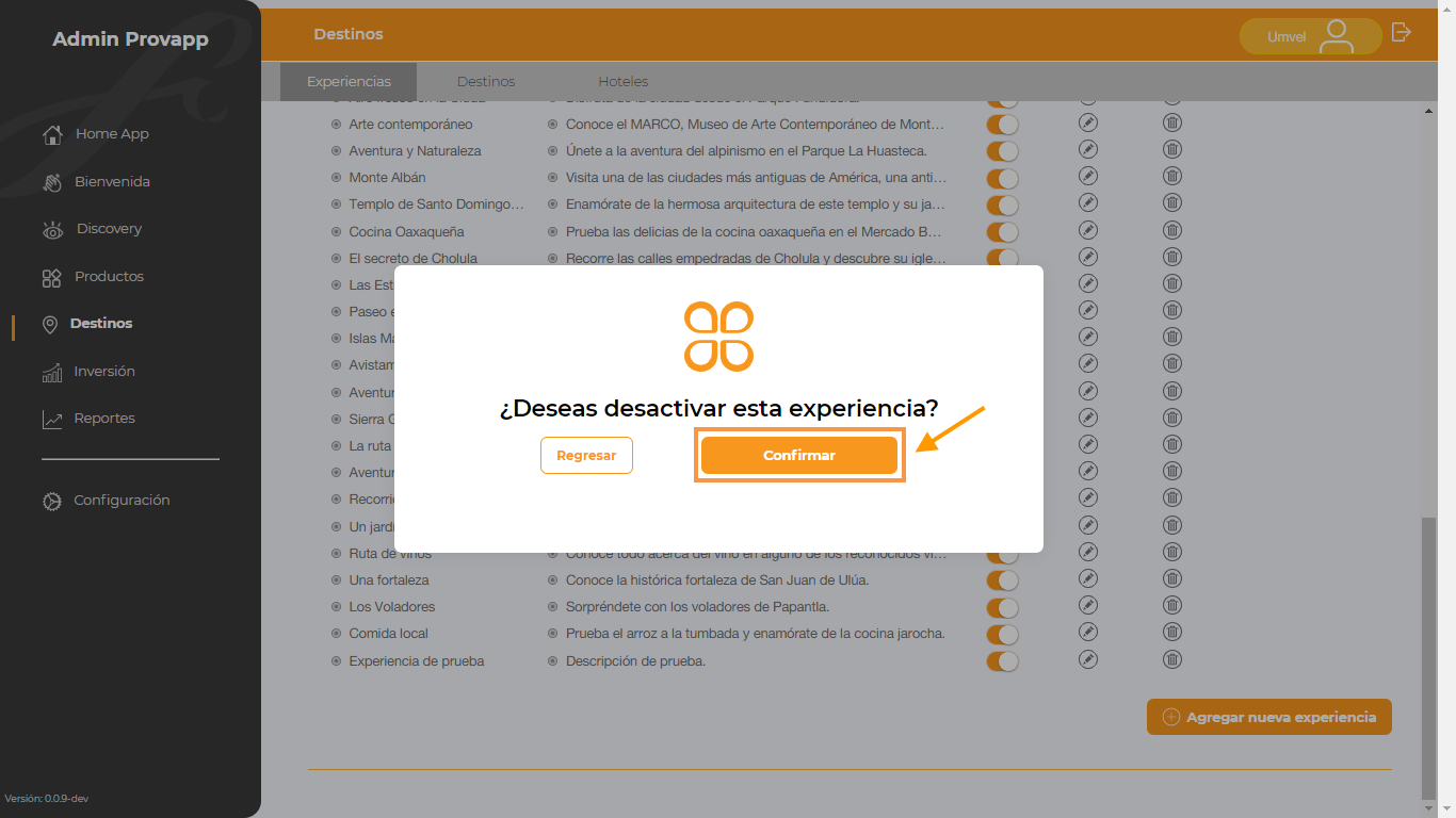 Nota importante: Si la experiencia se encuentra asociada un destino, no se podrá eliminar ni desactivar solo editar.