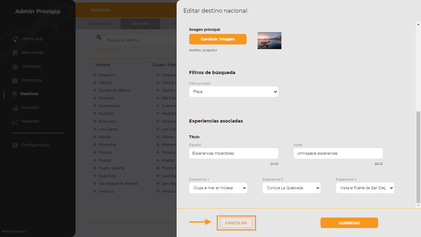 Nota: Deberá estar activo, y de esta forma al crear un hotel se pueda asociar al destino, de lo contrario no se visualizará en la sección Hoteles.