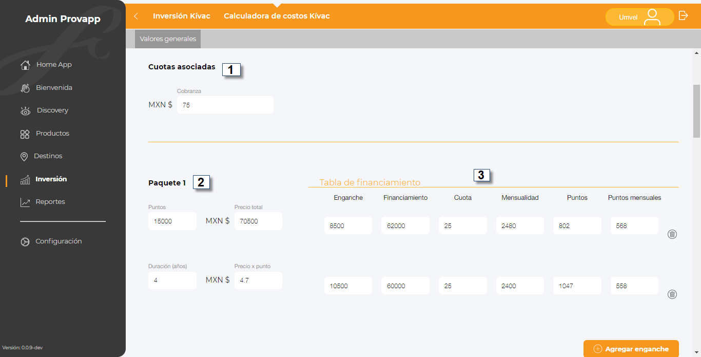 12.- Para poder agregar un enganche a la tabla de financiamiento, dando clic en el botón +Agregar un enganche